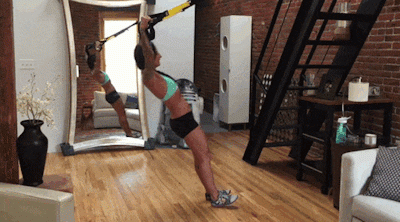 動(dòng)作要領(lǐng):雙手支撐身體,腳后跟勾住健身器械TRX的繩子,大腿彎曲到90度,再還原,1組20個(gè),3組