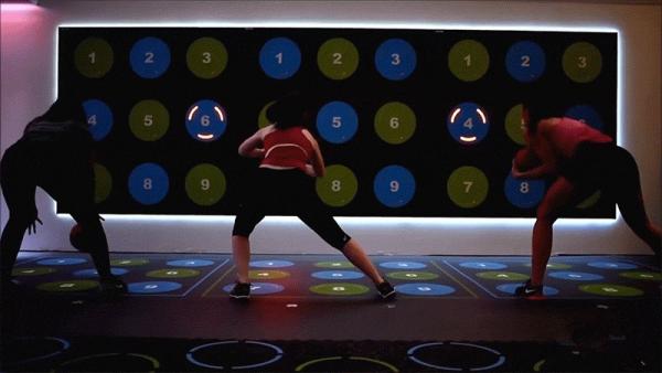 這個(gè)健身房的新穎之處在于,1800 平方英尺的面積內(nèi),墻面和地板上有很多數(shù)字、發(fā)光的燈圈,有點(diǎn)像是跳舞機(jī)和游戲場的設(shè)置。